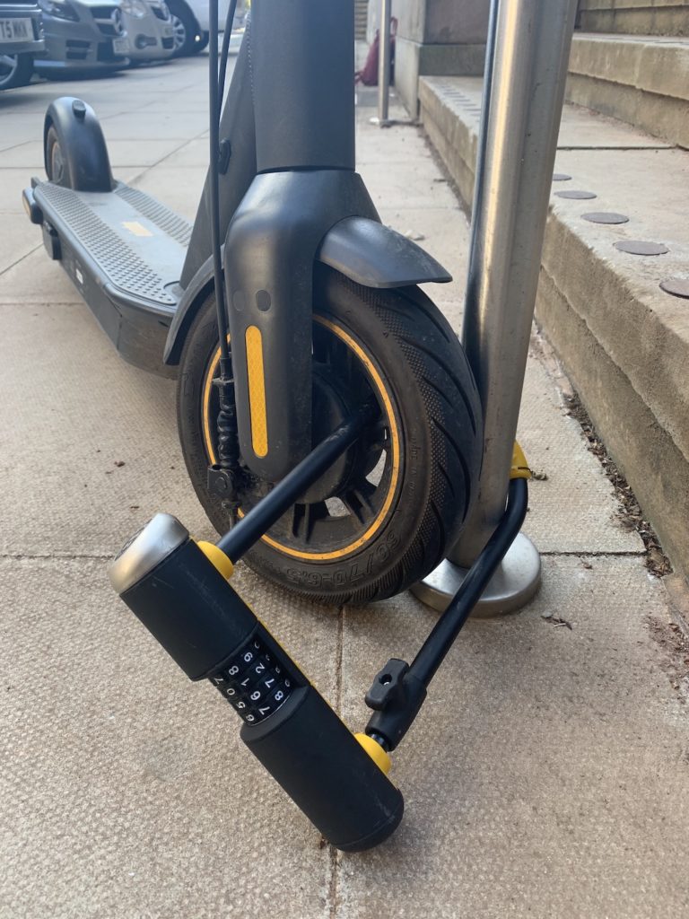 The Max comes with a software disabling feature via the app, but that’s no visual deterrent and therefore no substitute for a decent locking device. I’ve got two;